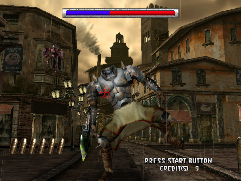 A rail shooter game in which you take on the world of the undead.  If you have the capability, it’s a pretty amazing light gun shooter but boy oh boy is this a difficult game.  You traverse five stages going from the streets of some old English looking town to a skyscraper.  You fight some crazy bosses, who aren’t too difficult, but they’re pretty awesome in their own right.  It’s wonderfully cheesy which is odd considering it’s a LATE 90s game.